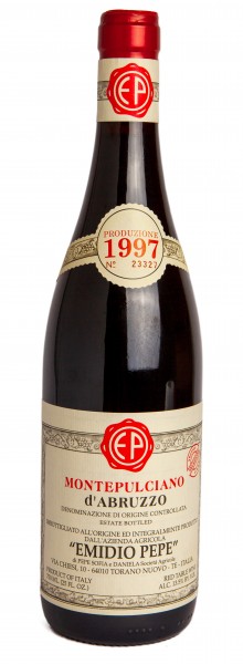 Tasting Notes: The Montepulciano is fermented for about 10-12 days and subsequently aged for 24 months in glass-lined cement, which Pepe prefers over oak. The wines are bottled with no sulfur and laid down to rest for several years in the cellar. As they age in bottle the wines undergo malolactic fermentation naturally. Before being released the bottles are opened and decanted one by one by hand into new bottles after which they are re-corked with the year of bottling on the cork, labeled and shipped. The 1997 offers multi-dimensional nuances of leather, tar and cherries on soft, delicate frame supported by youthful but fine tannins with excellent freshness on the finish.